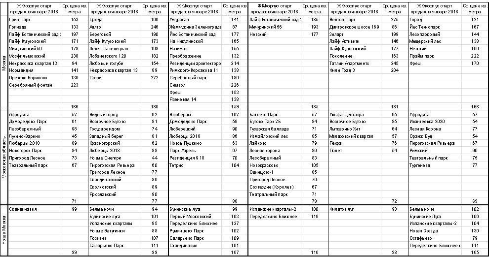 | Локация | ЖК/корпус старт продаж в январе 2018 | ЖК/корпус старт продаж в феврале 2018 | ЖК/корпус старт продаж в марте 2018 | ЖК/корпус старт продаж в апреле 2018 | ЖК/корпус старт продаж в мае 2018 | ЖК/корпус старт продаж в июне 2018 |