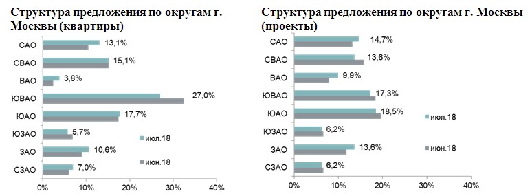 Как отмечают аналитики "Метриум", выход новых проектов и объемов оказал влияние на структуру предложения по административным округам. Увеличились доли САО (13,1%; +2,6 п.п.), ЗАО (10,6%; +1,5 п.п.), ВАО (3,8%; +1,4 п.п.), СЗАО (7,0%; +1,0 п.п.). Существенно сократилась доля ЮВАО (-5,5 п.п.), однако округ сохранил за собой лидерские позиции - 27%.