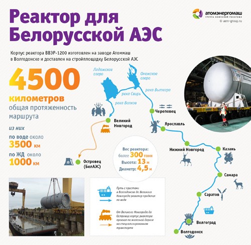 Изготовление корпуса реактора для первого энергоблока Белорусской АЭС было завершено в середине октября текущего года. Вес корпуса реактора ВВЭР-1200 превышает 330 тонн, высота – 12 метров, диаметр 4,5 метра. Для его транспортировки совместно со специалистами перевозочной компании была разработана уникальная мультимодальная логистическая операция. От филиала АО "АЭМ-Технологии" "Атоммаш" в г.Волгодонск Ростовской области корпус реактора был доставлен на специализированной автомобильной технике на причал Цимлянского водохранилища.