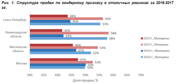 В большинстве из исследованных регионов женщины-покупательницы чаще мужчин приобретают жильё по ипотеке (от 52 до 56%); лишь в Москве среди заемщиков преобладают мужчины (52%). В 2017 году больше женщин купили квартиры небольших площадей, чем мужчины (их доля преобладает в диапазоне до 60 кв. м). Особенно эта разница видна в диапазоне до 30 кв. м., где доля покупательниц превышает 60% во всех исследованных регионах. Как правило, женщины покупают более дешевые квартиры (в разрезе продаж по бюджету покупки доля женщин выше в диапазоне до 8 млн руб. в Москве, до 5 млн руб. в Московской области). В Московском регионе доля покупательниц с бюджетом до 2 млн. руб. превышает 60%.