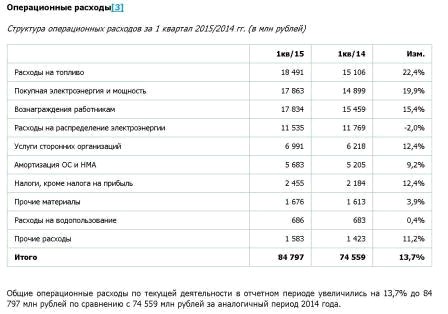 Рост операционных расходов в 1 квартале 2015 года на 13,7%, в основном в результате увеличения расходов на топливо, покупную электроэнергию и мощность, а также расходов на вознаграждения работникам;