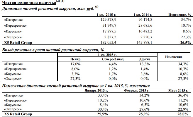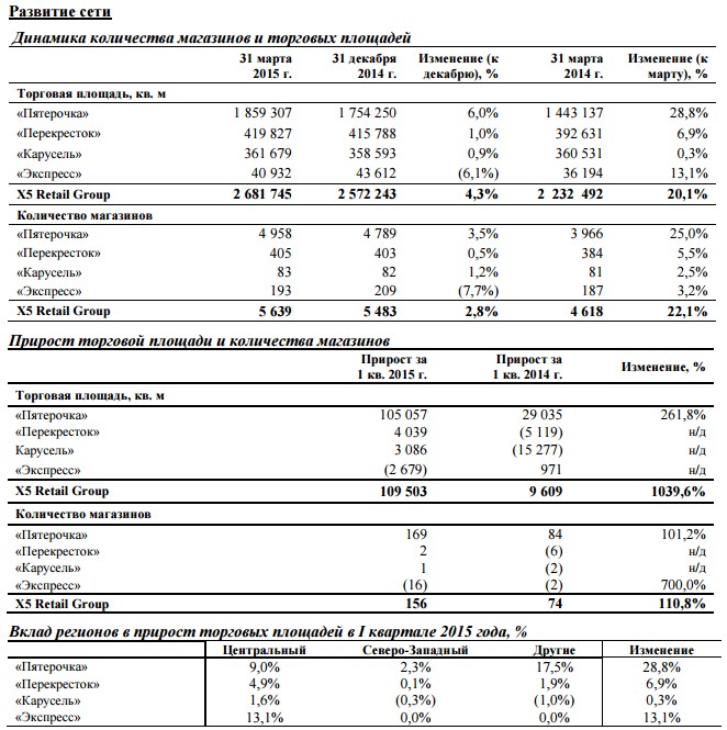 Х5 открыла 156 магазинов (за вычетом закрытий), что более чем в два раза превышает результат первого квартала 2014 г. (74 магазина); рост торговых площадей (в основном органический) на 31 марта 2015 г. составил 20,1% по сравнению с 31 марта 2014г.