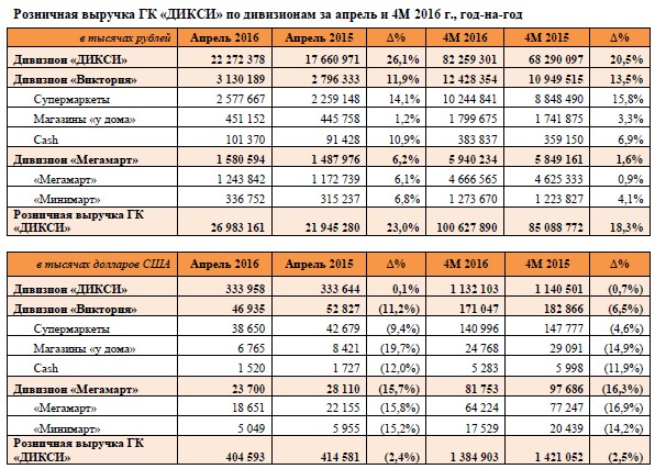 Розничная выручка ГК "ДИКСИ" за первые четыре месяца 2016 года выросла на 18,3% в рублях (сократилась на 2,5% в долларах США) год-на-год и составила 100,6 млрд рублей (1,4 млрд долл. США).