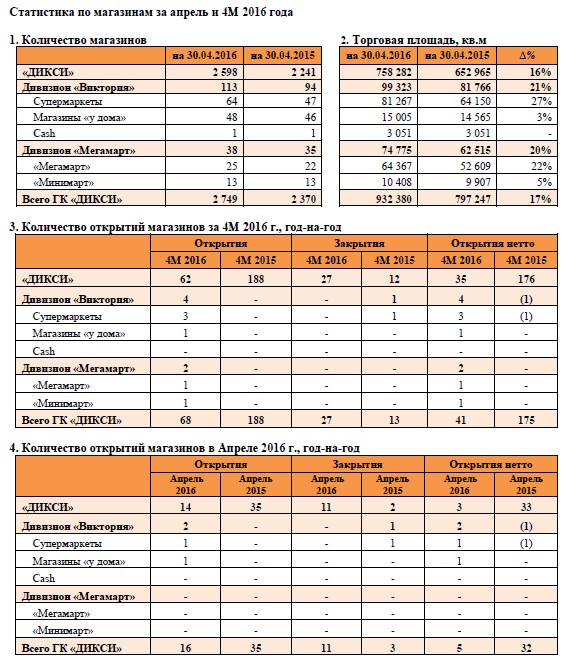 По состоянию на 30 апреля 2016 года Компания управляла 2 749 магазинами, включая 2 598 магазинов "у дома" "ДИКСИ", 112 магазинов "Виктория", 1 магазин Cash и 38 компактных гипермаркетов "Мегамарт" и "Минимарт".
