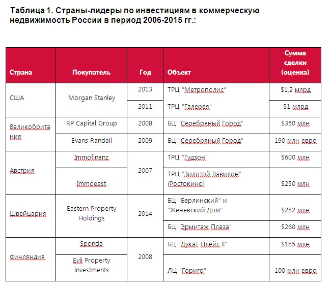 · Крупнейшим иностранным игроком на рынке инвестиций в коммерческую недвижимость России в 2006-2015 гг. стал американский фонд Morgan Stanley ($2,2 млрд). В 2011 и 2013 гг. Morgan Stanley заключил самые большие на рынке коммерческой недвижимости сделки по покупке ТРЦ "Галерея" ($1 млрд) и ТРЦ "Метрополис" ($1,2 млрд). Также в топ-5 вошли австрийская инвестиционная компания Immofinanz ($1,6 млрд), американская инвестиционная компания Hines ($1,18 млрд), швейцарский фонд Eastern Property Holdings ($0,97 млрд), дочерняя структура британской инвестиционной группы Raven Group фонд Raven Russia ($0,69 млрд).