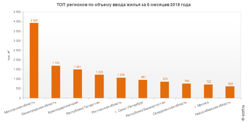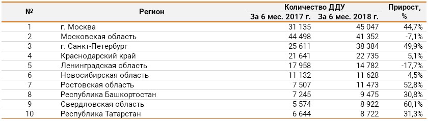 По данным Росреестра по итогам 6 месяцев 2018 года в ТОП-10 регионов по количеству зарегистрированных договоров участия в долевом строительстве (ДДУ) вошли Москва, Московская область, Санкт-Петербург, Краснодарский край, Ленинградская область, Новосибирская область, Ростовская область, Республика Башкортостан, Свердловская область и Республика Татарстан.