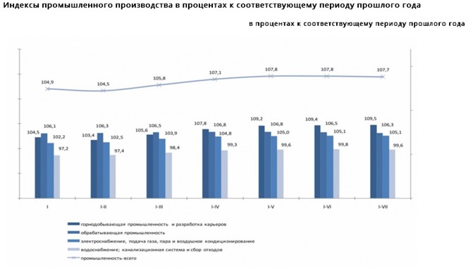Возросло производство продуктов питания, нефтепереработки, продукции фармацевтической, металлургической промышленности и машиностроения. При этом снизилось производство табачных изделий.