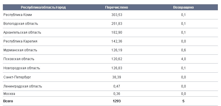 В бюджеты субъектов Северо-Западного региона, включая местные бюджеты (в качестве налога на имущество, региональной составляющей налога на прибыль, налога на доходы физических лиц, транспортного, земельного налогов и прочих отчислений), перечислено – 1 293 млн рублей, возвращено переплат – 5 млн рублей, итого – 1288 млн рублей (29% от общей суммы налогов и иных обязательных платежей Общества).