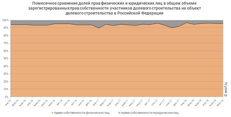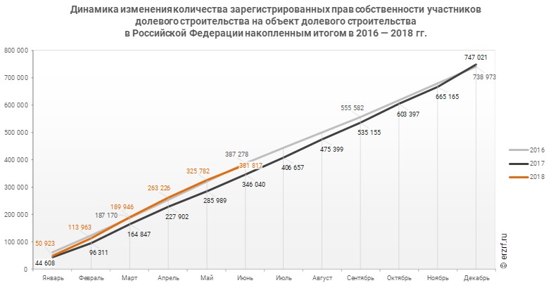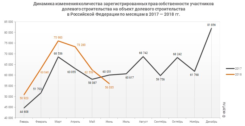 В июне 2018 года в РФ зарегистрировано 56 035 прав собственности участников долевого строительства на объект долевого строительства. Это на 10,4% меньше, чем в мае (62 556 прав), и на 23,5% — чем в апреле текущего года, когда было зарегистрировано 73 280 прав.