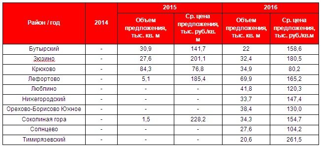 В тройку лидеров по объему нового предложения вошли Лефортово (69,9 тыс. кв. м), Люблино (41,8 тыс. кв. м) и Орехово-Борисово Южное (38,4 тыс. кв. м). При этом самая высокая цена зафиксирована в Тимирязевском районе – 261,5 тыс. руб./ кв. м.