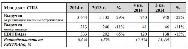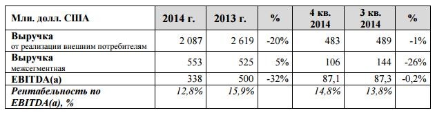 Показатель EBITDA(a) в 2014 году на 3% ниже по отношению к 2013 году. С учетом снижения выручки на 25% год к году, рентабельность по EBITDA(a) выросла до 11%.
