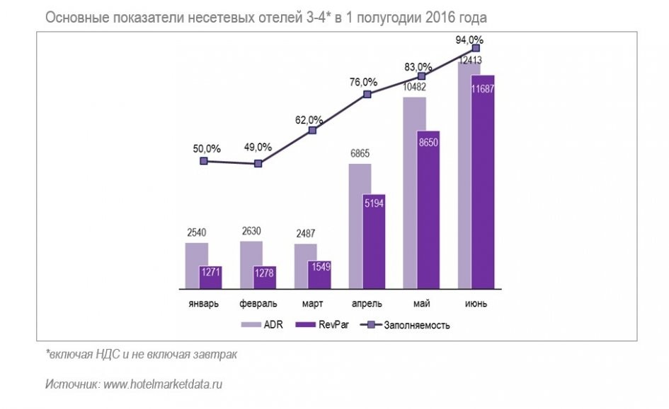 По данным hotelmarketdata.ru, в первом полугодии 2016 года показатель заполняемости несетевых отелей категории 3* и 4* в Петербурге также оказался выше, чем за аналогичный период 2015 года (+5 п.п.) и составил 69%. Увеличение загрузки наблюдалось в каждом месяце, а наибольший рост пришелся на март и апрель 2016 года, отмечают в Maris. Основные причины — увеличение туристического потока со стороны как российских, так и иностранных туристов — в первую очередь из Юго-Восточной Азии и Ближнего Востока. Помимо этого сказался и общий рост деловой активности в городе.