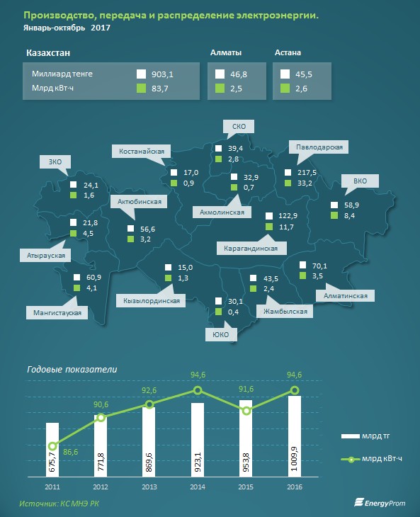В стоимостном выражении годовой рост объемов производства, передачи и распределения электроэнергии составил 11,6%, до 903,1 млрд тенге.