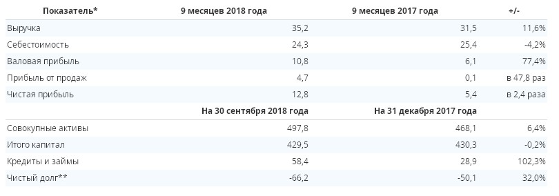 Прибыль от продаж за 9 месяцев 2018 года составила 4,7 млрд рублей против 0,1 млрд рублей за 9 месяцев 2017 года.