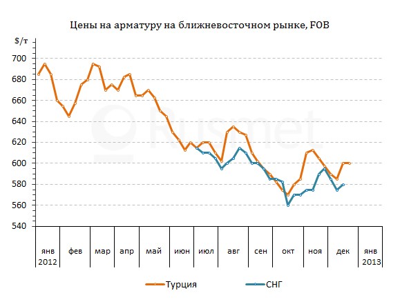 Спад на ближневосточном рынке длинномерного проката, наблюдавшийся в первой половине декабря, в последнюю неделю сменился осторожным повышением. Подорожание металлолома заставило турецких металлургов заняться пересмотром котировок как на внутреннем рынке, так и за рубежом. Стоимость арматуры, в начале второй декады декабря сократившаяся до $580-590 за т FOB, поднялась до $595-605 за т FOB, а некоторые компании выставляют предложения на уровне $600-615 за т FOB. На внутреннем рынке арматура подорожала от менее $600 до $595-610 за т EXW (без НДС).