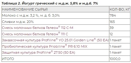 После того как мы обсудили подходящую технологию производства высокобелкового йогурта, предупредили все риски, которые могут возникнуть в ходе технологического процесса, можно приступать к изготовлению готового продукта. Специалисты ГК "СОЮЗСНАБ" подготовили подробную рецептуру греческого йогурта с высоким содержанием белка (см. таблицу 2) и пошагово описали технологию приготовления.