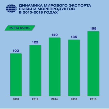 Мировая рыбная отрасль растет хорошими темпами. Рыба и морепродукты относятся к числу наиболее торгуемых на мировом рынке видов продовольствия. Россия пока не полностью использует свой экспортный потенциал – в 2018 году страна заняла девятое место среди крупнейших мировых экспортеров, а по итогам 2019 года предварительно поднялась на восьмое. В то же время, все последние годы наблюдается уверенный рост российского экспорта рыбы и морепродуктов.