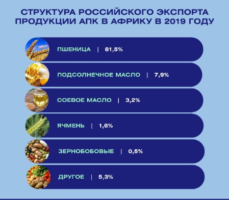 Россия в 2019 году поставила в страны Африки продукции АПК на сумму 3,2 млрд долл. Крупнейшими позициями стали пшеница (2,6 млрд долл.), подсолнечное (257 млн долл.) и соевое масло (104 млн долл.). По оценке Федерального центра "Агроэкспорт", потенциал рынков африканских стран позволяет увеличить этот объем более чем на 6,5 млрд долл.