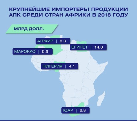 На страны Африки приходится около 5% мирового импорта агропродовольственной продукции. В 2018 году континент закупил продуктов питания и сельскохозяйственного сырья на сумму 83 млрд долл. Около 44% этого объема пришлось на Северную Африку, 22% – на Западную, 15% – на Восточную, 11% – на Южную и 8% – на Центральную. В разрезе стран крупнейшими импортерами стали Египет (15 млрд долл.), Алжир (8,3 млрд долл.), ЮАР (6,8 млрд долл.), Марокко (5,9 млрд долл.) и Нигерия (4,1 млрд долл.).
