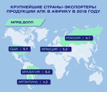 Крупнейшими экспортерами в страны Африки в 2018 году являлись Бразилия с долей 7,5%, Франция (6,2%), США (6,1%), Россия (5,9%) и Аргентина (5%). Ключевыми позициями экспорта Бразилии на африканский континент были сахар, говядина и кукуруза, Франции – пшеница, мучные изделия и сахар, Соединенных Штатов – соевые бобы, кукуруза и мясо птицы.
