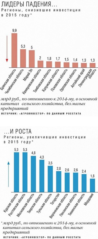 На третьем месте в рэнкинге находится Брянская область, в прошлом году объем инвестиций составил 15,8 млрд руб., что почти на 9,9 млрд руб. меньше, чем в 2014-м. По объему снижения вложений регион стал первым в стране, правда, он также лидирует и по показателю суммарных инвестиций за три года (61,9 млрд руб.). В прошлом году ВРП достиг 273,5 млрд руб., в том числе почти 75 млрд руб. принесло сельское хозяйство. За прошедшие два года доля сектора в экономике области поднялась с 7% до 12,5%. Крупнейшим инвестором в АПК региона является «Мираторг». Компания продолжает развивать здесь проект мясного скотоводства, в частности, готовится заместить импортный племенной скот (продолжение темы — на стр. 56).