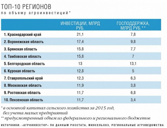 Шестую строку рэнкинга занимает с 12,8 млрд руб. Курская область, ставшая лидером страны по динамике роста инвестиций в сельское хозяйство. По сравнению с 2014-м, в прошлом году они увеличились на 5,3 млрд руб. По сумме за три года (35,3 млрд руб.) регион стал седьмым. При этом, хотя объемы инвестиций здесь незначительно ниже, чем в Белгородской области, предусмотренный в 2015 году объем господдержки был в 2,6 раза меньше — 5 млрд руб.