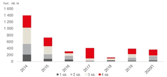 По предварительным итогам, подготовленным аналитиками JLL, в 1-м квартале 2020 года в эксплуатацию будет введен только один бизнес-центр "Квартал-Вест" класса В+ арендопригодной площадью 36,4?тыс.?кв. м.