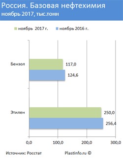 В ноябре в России было наработано 250 тыс. т этилена, что на 2,5% меньше, чем за аналогичный период 2016 года (256,4 тыс. т) и на 21,8% больше по сравнению с октябрем 2017г. Прирост за январь-ноябрь 2017г. к январю-ноябрю 2016г. составил 2,3%, всего за одиннадцать месяцев текущего года выпущено 2168,7 тыс. т этилена. Бензола в отчетном периоде было произведено 117 тыс. т, это на 6,1% меньше по сравнению с ноябрем прошлого года (124,6 тыс. т) и на 2,6% больше показателя октября текущего года. Всего с начала года выпущено 1224 тыс. т бензола (увеличение к показателю январь-ноябрь 2016г. составило 4,8%).
