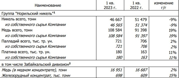 В первом квартале 2023 года производство меди Группой (включая Забайкальский дивизион) выросло на 19% до 109 тыс. тонн (все произведено из собственного сырья) по сравнению с аналогичным периодом прошлого года. Рост связан с низкой базой первого квартала прошлого года, когда на Медном заводе Норильского дивизиона проходил ремонт печи Ванюкова.