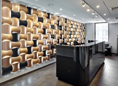 Панели из шпона натурального ореха системы NAYADA-Regina-Line лаконичны, но с богатой текстурой, подчеркивают респектабельность компании и помогают создать продуктивную деловую атмосферу.