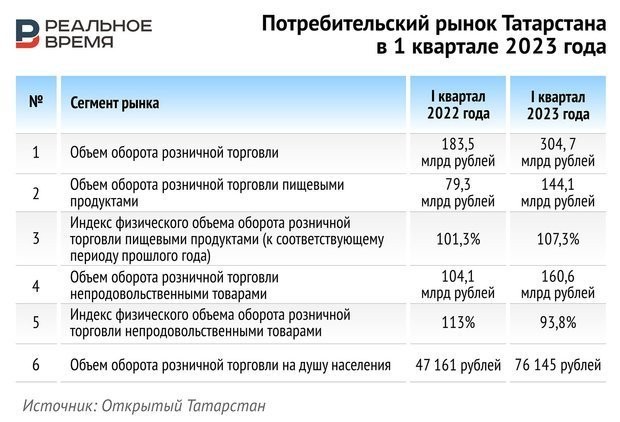 В абсолютных цифрах оборот потребительского рынка в 2023 году вырос — так, на душу населения в первом квартале в Татарстане он увеличился с 47 161 до 76 145 рублей.