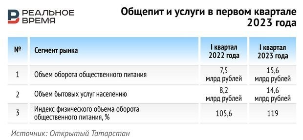 Объем оборота общественного питания в республике вырос на 19% — до 15,6 млрд рублей. В январе — марте 2022 года было 11,8 млрд рублей.