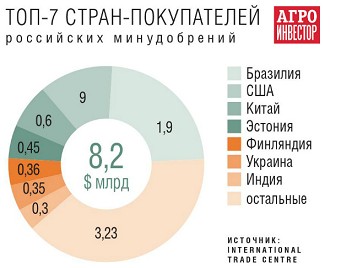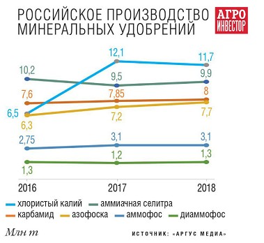 По данным Росстата, в прошлом году в России в действующем веществе было произведено 22,8 млн т минеральных удобрений - на 1,4% больше, чем в 2017-м. Производство азотных удобрений, в частности, увеличилось на 3,7% до 10,4 млн т, фосфорных - на 3,5% до 3,9 млн т, а вот калийных снизилось на 2,1% до 8,4 млн т. Россия входит в пятерку крупнейших мировых производителей, разделяя лидерство с Китаем, Индией, США и Бразилией, напоминает старший менеджер проектов отдела специальных исследований агентства "Клеффманн Групп" Гор Манукян. Вместе с тем, по данным Всемирного банка, лишь около 10% от общего российского производства минудобрений потребляется внутри страны. Отрасль является преимущественно экспортоориентированной, обращает внимание эксперт. С 2016-го вывоз данных продуктов в натуральном выражении рос в среднем на 11% в год и в 2018-м достиг, по данным International Trade Map (ITM), 11,3 млн т.