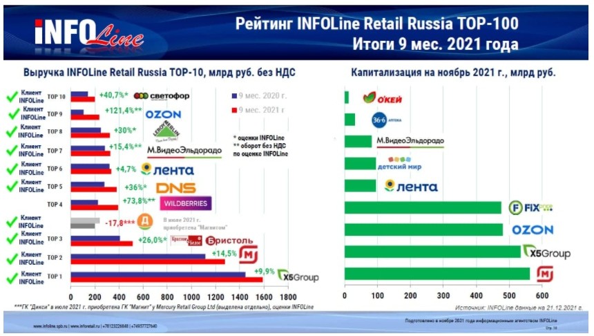 При этом на первую десятку компаний-лидеров рейтинга INFOLine Retail Russia TOP-10 уже приходится почти 30% всего товарооборота в стране. Также отмечается, что "Светофор" и Ozon вытеснили во вторую десятку рейтинга компании "Ашан" и Metro Cash&Carry. Спикеры онлайн-конференции подчеркнули, что в 2022 году впервые в истории российского потребительского рынка 100 крупнейших компаний будут контролировать более половины всего розничного оборота нашей страны.