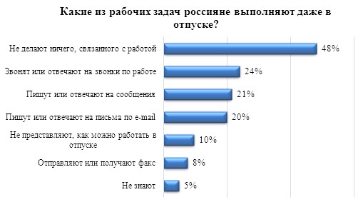 В ходе опроса менее половины россиян – 48% – сообщили, что на отдыхе не выполняют никаких задач по работе. При этом даже в отпускной период 24% наших соотечественников продолжают делать деловые звонки и отвечать на них, 21% – пишут сообщения, 20% – отправляют письма, касающиеся рабочих вопросов, по электронной почте, а 8% – используют факс. И только 10% российских путешественников не представляют себе, как можно работать в отпуске.