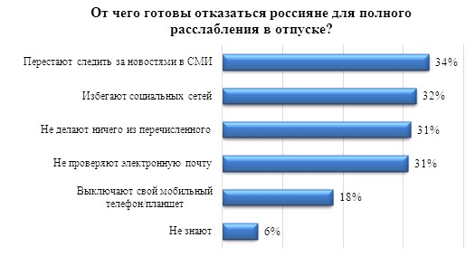 Для полноценного отдыха многие россияне не готовы отказаться и от многих других привычных вещей. Так, в отпуске только треть наших соотечественников (34%) перестает следить за новостями в СМИ, 32% российских туристов не заходят в социальные сети, 31% – не проверяют электронную почту. И всего 18% полностью выключают мобильный телефон или планшет. Причем чаще прекращают использовать гаджеты в отпуске мужчины (23%), чем женщины (15%).