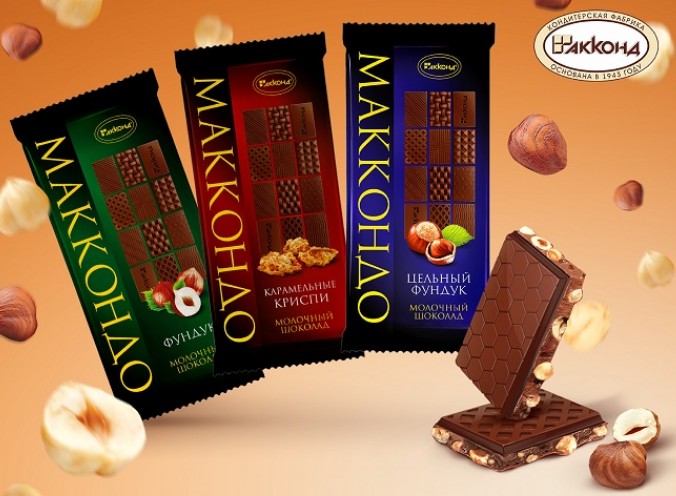 В октябре "АККОНД" выпустил новинку - серию плиточного молочного шоколада нового формата под брендом "МАККОНДО". Продукт выпускается в трех вкусовых вариантах – с цельным, дробленным фундуком и карамельными криспи.