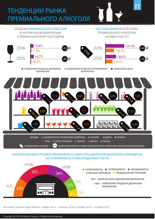 На российском рынке продажи премиального алкоголя (база крепкого алкоголя, не включая водку, с учетом шампанского и игристого вина) в натуральном выражении стабильны второй год подряд: за период с ноября 2015 по октябрь 2016 показатель прироста составил +1,3% против +0,6% за тот же период прошлого года, согласно данным ритейл-аудита Nielsen. В денежном выражении продажи демонстрируют рост: +5,9% — в 2016 году, +6,7% — в 2015. Цены в категории премиального алкоголя продолжили расти, но темпы немного замедлились: с 6,2% в прошлом году до 4,5% в 2016 году.