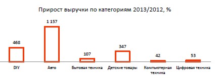 В развитии ассортимента все большую роль играют новые категории товаров, подтверждая, таким образом, эффективность нашей универсальной платформы. Абсолютным лидером прироста стали автотовары - 1 157 %. Сегмент ЭГ^ показал 468 %. Одно из перспективных направлений - детские товары - 347 %.