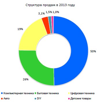 Доля новых категорий показывает значительный рост, однако традиционные для компании категории продолжают оставаться основными источниками формирования выручки. Доля в структуре продаж компьютерной техники - 50 %, бытовой техники - 26 %, цифровой электроники - 19 %.