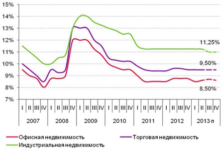 Динамика ставок капитализации по сегментам коммерческой недвижимости