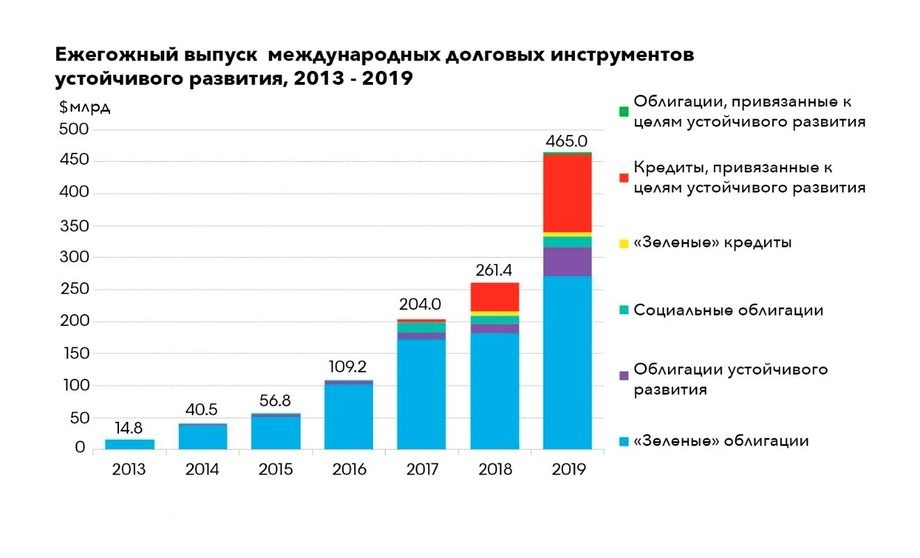 По данным, представленным Bloomberg NEF, в 2019 году был установлен новый рекорд по объему долговых инструментов устойчивого развития, выпущенных на мировом рынке в течение одного года, с общим объемом 465 миллиардов долларов США, что на 78% больше по сравнению с 261,4 миллиардами долларов США для 2018 года.