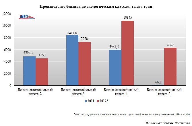 По данным анализа Базы событий "Нефте- и газоперерабатывающая промышленность и производство биоэтанола" и Базы событий "Топливный рынок РФ", подготовленных специалистами ИА "INFOLine", в 2012 году производство бензина автомобильного класса 2 снизилось на 6,5%, класса 3 – на 13,5%, производство автомобильного бензина класса 4 увеличилось на 82%. Благодаря активному вводу в эксплуатацию во второй половине 2012 года установок вторичной переработки нефти, предназначенных для выпуска топлив высокого экологичесокого класса, производство бензина автомобильного класса 5 в 2012 году увеличилось более чем в 9 раз по сравнению с 2011 годом.