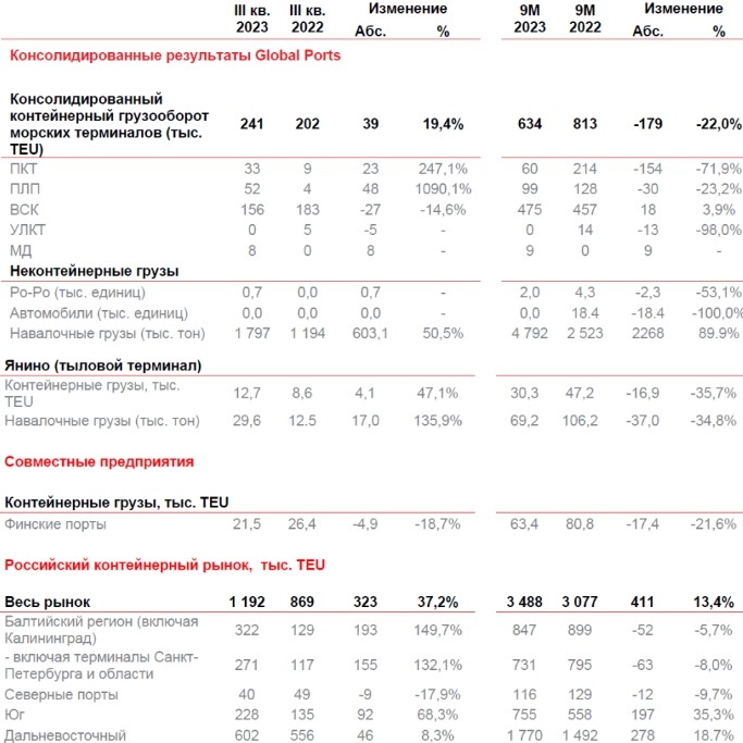 Результаты операционной деятельности Global Ports за III квартал и 9 месяцев 2023 года.