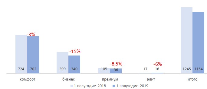 Совокупный выход нового предложения повысился с 1,25 млн кв. м в первом полугодии 2018 года до 1,36 млн кв. м в первом полугодии 2019 года. В разрезе сегментов новостроек в комфорт-классе рост составил 23% - с 541 тыс. кв. м до 663 тыс. кв. м, в элит-классе выход нового предложения увеличился в 3,5 раза - с 18 тыс. кв. м до 64 тыс. кв. м. При этом в категории "бизнес" отмечено снижение показателя - с 586 тыс. кв. м до 528 тыс. кв. м, или на 10%, в то время как рынок премиум сегмента остался стабилен.