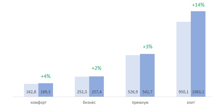 Что касается средней цены квадратного метра, то по итогам второго квартала 2019 года по сравнению со вторым кварталом 2018 года наблюдается рост во всех сегментах новостроек. Так, в комфорт-классе средняя стоимость квадратного метра увеличилась на 4% и составила 169,3 тыс. рублей, в бизнес-классе - на 2% и установилась на уровне 257,4 тыс. рублей, в премиум-классе - на 3% с ценой в 542,7 тыс. рублей, сегмент "элит" со средней стоимостью 1083,1 тыс. рублей показал повышение показателя на 14%.