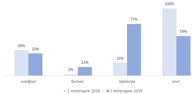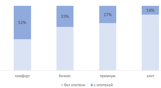 По итогам первого полугодия 2019 года доля сделок с ипотекой в комфорт-классе составила 52% благодаря доступности ипотечных кредитов и снижению процентных ставок. В бизнес-классе 33% сделок проведены с ипотекой, в премиум-классе - 27%, в элит-классе - 14%. Сложившаяся ситуация объясняет высокую зависимость сегмента недвижимости "комфорт" от сделок с привлечением ипотеки, в то время как рынок элит-класса мало чувствителен к ипотечной ставке.