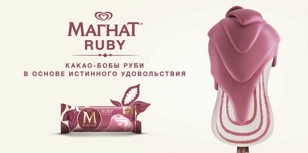 Шоколад из какао-бобов Руби — это удивительное открытие в мире шоколада за последние 80 лет. Его называют четвертым видом шоколада (после белого, молочного и горького). Он восхищает своим натуральным рубиновым цветом и нежным ягодным вкусом, который придают ему какао-бобы Руби. Их выращивают в особых климатических условиях на территории Эквадора, Бразилии и Кот-д’Ивуара. Бельгийский шоколад премиального качества Руби изготавливается без добавления красителей и фруктовых ароматизаторов, а сам процесс его создания строго конфиденциален. Шоколад Руби стал отличным дополнением к премиальной коллекции эскимо от Магнат с натуральным и одним из самых эксклюзивных в портфеле бренда шоколадом.